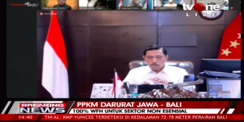 Begitu tutur Menteri Koordinator Bidang Maritim dan Investasi, Luhut Binsar Pandjaitan saat mengurai teknis PPKM Darurat dalam jumpa pers yang digelar sesaat lalu, Kamis (1/7).