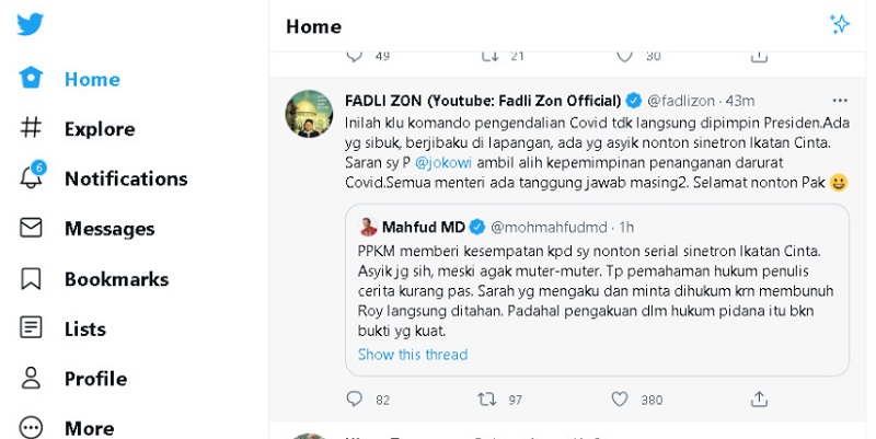 "Inilah kalau komando pengendalian Covid tidak langsung dipimpin Presiden. Ada yang sibuk, berjibaku di lapangan, ada yang asyik nonton sinetron Ikatan Cinta," kicau Fadli Zon membalas kicauan Mahfud MD.