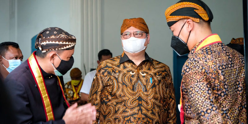 Airlangga juga menyempatkan diri melihat situasi Keraton Kasunanan di Talang Paten. Ketua Umum DPP Partai Golkar ini mengenakan batik cokelat lengkap dengan blangkon dan samir saat menikmati suasana Keraton.