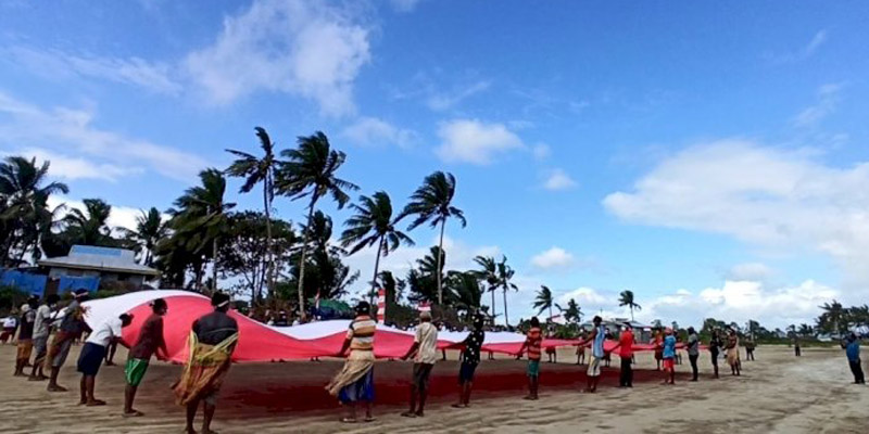 Hingga akhirnya tepat pada pukul 14.00 WIT, bendera Merah Putih berukuran raksasa itu untuk pertama kalinya membentang di Pantai Imbuti dan langsung disambut dengan sorak sorai masyarakat yang hadir.