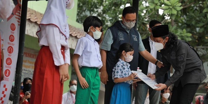 Salah satu bentuk kepedulian terhadap anak-anak tersebut, Gubernur DKI Jakarta, Anies Baswedan, menyerahkan beasiswa pendidikan yang dibarengi dengan kegiatan vaksinasi massal untuk pelajar, di Cilincing, Jakarta Utara, Senin (27/9).