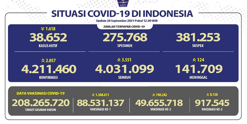 Data Satgas Covid-19 juga memberikan informasi terbaru terkait vaksinasi. Dari target 208.265.720 orang, sudah 88.531.137 orang yang sudah tervaksin dosis pertama, dan 49.655.78 orang sudah tervaksin dosis kedua.