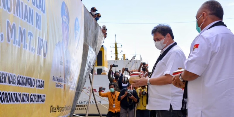 Acara pelepasan jagung oleh Menko Airlangga ditandai dengan pemecahan kendi ke lambung Kapal Hodasco 19, yang merupakan salah satu dari tiga kapal yang secara bersamaan akan mengirim jagung dari Gorontalo ke beberapa tujuan.