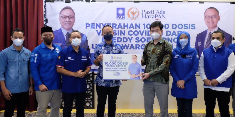 Penyerahan secara simbolis vaksin Covid-19 dilakukan langsung Eddy Soeparno kepada Kepala Dinkes Cianjur dan disaksikan oleh Ketua Umum PAN Zulkifli Hasan.