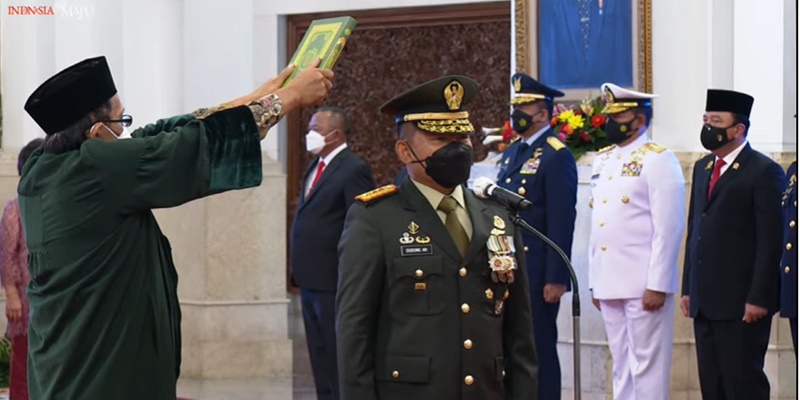 Letjen Dudung disumpah secara langsung oleh Presiden Joko Widodo di Istana Negara, Rabu (17/11). Dalam sumpah jabatannya, Letjen Dudung disumpah di bawah Alquran.