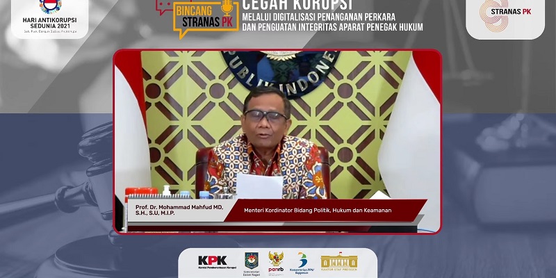 Hal itu disampaikan oleh Menteri Koordinator Bidang Politik, Hukum dan Keamanan, Mahfud MD, di acara Bincang Strategi Nasional Pencegahan Korupsi (Stranas PK) bertajuk "Cegah Korupsi Melalui Digitalisasi Penanganan Perkara dan Penguatan Integritas Aparat Penegak Hukum" yang disiarkan di akun YouTube Stranas PK Official, Kamis (2/12).