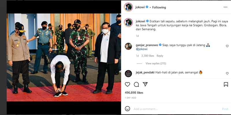 Hal itu terlihat pada unggahan Presiden Joko Widodo di akun Instagramnya. Presiden mengunggah sebuah foto dirinya sedang membungkuk memperbaiki tali sepatu sebelum melakukan kunjungan kerja di beberapa lokasi di Jawa Tengah.