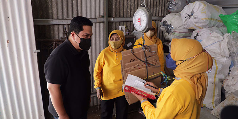 Saat berbincang dengan Juju, salah satu pengelola bank sampah, Erick Thohir memberikan saran agar para pengelola aktif mensosialisasikan pada warga untuk memilih menabungkan sampah.