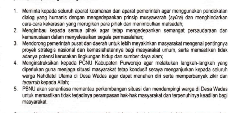 "Memastikan tidak terjadinya perampasan hak-hak masyarakat dan terpenuhinua keadilan bagi masyarakat," demikian sikap tertulis PBNU yang ditandatangani oleh Ahmad Fahrur Razi sebagai Ketua dan Abdul Qodir selaku Wakol Sekretarsi jenderal PBNU.