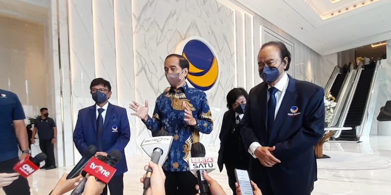 Kemesraan tampak pada pertemuan Presiden Joko Widodo dan Ketua Umum Partai Nasdem, Surya Paloh. Keduanya akrab ketika berkeliling melihat tower Nasdem yang baru diresmikan hari ini, Selasa (22/2).