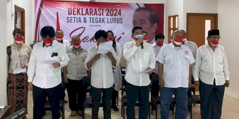 "Kami relawan dan pendukung militan Presiden Jokowi yang berada di seluruh Indonesia hingga luar negeri dengan ini bersumpah dan berikrar 2024 setia dan tegak lurus bersama Jokowi, satu komando mendukung penuh program dan strategi pemerintah dalam mengatasi pandemi Covid-19 dan pemulihan ekonomi nasional," kata para relawan yang dipimpin oleh Silfester.