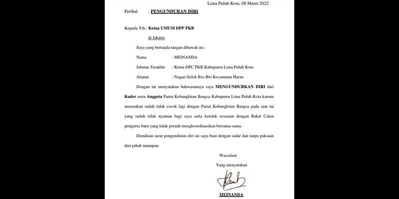 Ketua DPC PKB Kabupaten Limapuluh Kota, Sumatera Barat, Meinanda, keputusannya untuk mundur telah dipertimbangkan dengan matang. Utamanya, karena Cak Imin mengingkari janjinya pada Muktamar PKB Bali.