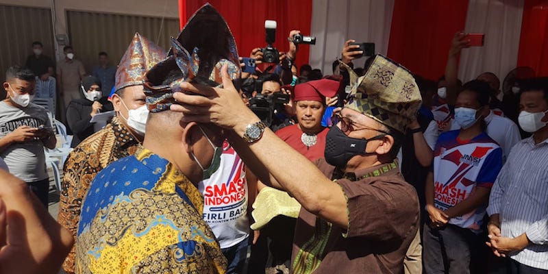 Selanjutnya, Yan Fitri Halimansyah secara simbolik memasangkan Tanjak Tebing Runtuh kepada Firli dan Tanjak Nakhoda Trong untuk Teguh Santosa sebelum memasuki balai pertemuan.