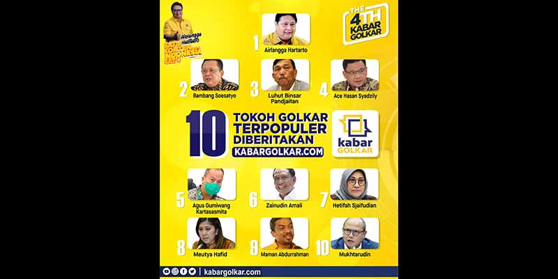 Kabar Golkar merilis 10 tokoh Golkar terpopuler. Peringkat pertama, adalah Ketua Umum Partai Golkar Airlangga Hartarto.