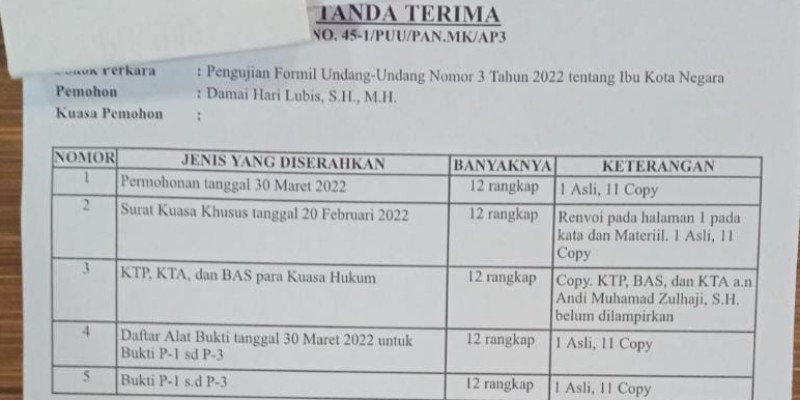 "Kami atas nama Aliansi Anak Bangsa telah mengajukan gugatan atau JR ke Mahkamah Konstitusi perihal uji formil atau teknis pembuatan UU, dan uji materil terhadap UU 3/2022 tentang Ibukota Negara," ujar Damai kepada Kantor Berita Politik RMOL, Rabu (30/3).