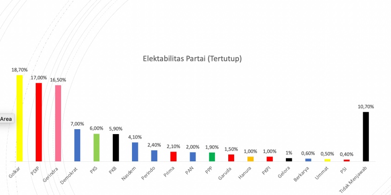 Lalu ada Gerindra dengan 16,5 persen, Demokrat 7,0 persen, PKS 6 persen, PKB 5,9 persen, dan Nasdem 4,1 persen. Sedangkan partai lainnya di bawah 4 persen pada survei mengenai elektabilitas partai secara tertutup itu.
