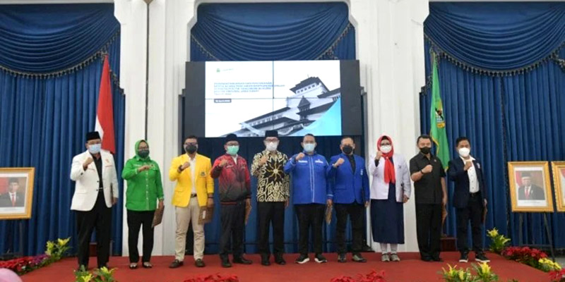 Penandatanganan dan penyerahan berita acara pencairan bantuan keuangan dilakukan oleh Gubernur Jawa Barat, Ridwan Kamil, bersama 10 pimpinan Parpol di Aula Barat Gedung Sate, Senin (18/4).