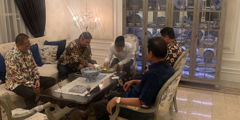 Kantor Berita Politik RMOL di lokasi, Airlangga ditemani Bendahara Umum Partai Golkar Dito Ganinduto. Keduanya lebih dahulu tiba dan duduk di ruangan depan Rumah Herirage Sam Ratulangi.