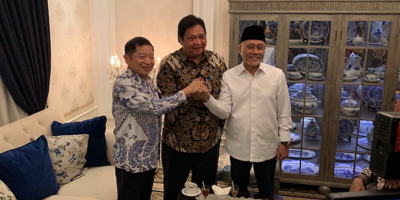 Kantor Berita Politik RMOL di lokasi, Airlangga yang ditemani Bendahara Umum Partai Golkar Dito Ganinduto menyambut kedatangan Ketua Umum PAN Zulkifli Hasan bersama Wakil Ketua Umum PAN Asman Abnur.
