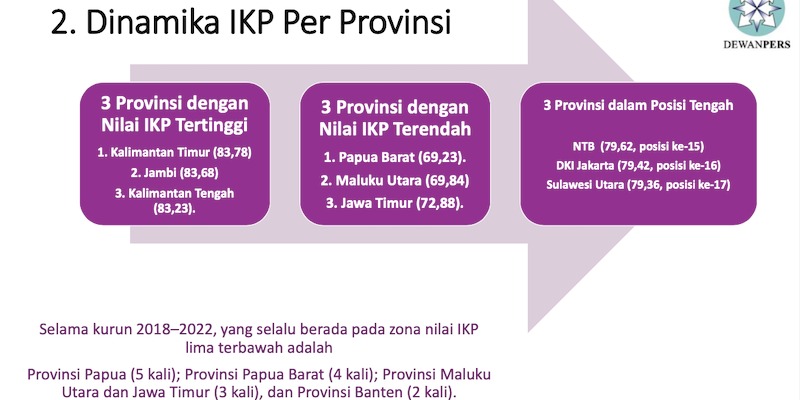 “Mencatat tiga provinsi dengan nilai IKP tertinggi, yakni Kalimantan Timur (83,78), Jambi (83,68), dan Kalimantan Tengah (83,23),†ujar Ketua Komisi Penelitian, Pendataan dan Ratifikasi Pers, Ninik Rahayu dalam keterangannya di Jakarta, Jumat (26/8).