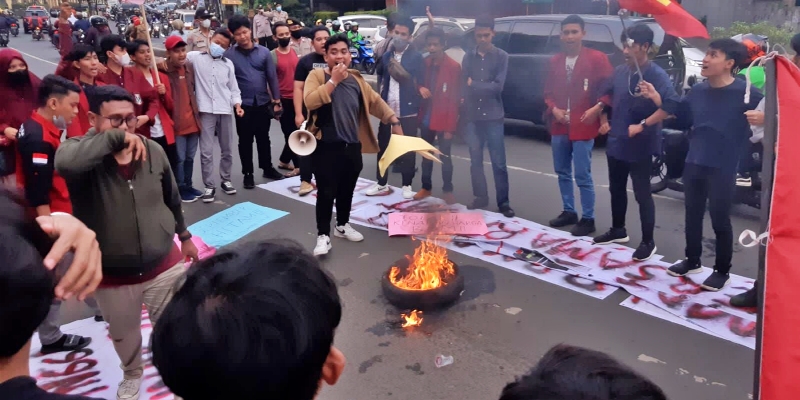 Dalam aksinya, puluhan mahasiswa yang mengenakan almamater merah itu menyuarakan penolakan terhadap kenaikan harga bahan bakar minyak (BBM) bersubsidi.