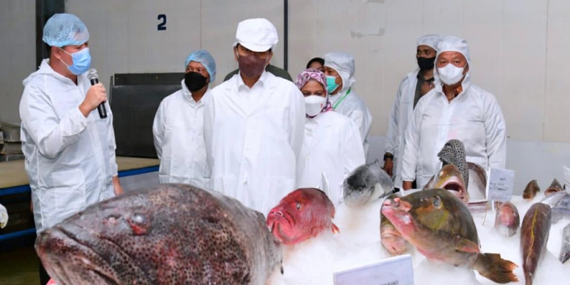 Presiden Jokowi didampingi Iriana Jokowi melakukan kunjungan kerja ke PT Samudera Indo Sejahtera (SIS) di Kota Tual, Rabu (14/9). Kedatangan Presiden Jokowi didampingi Menteri Pertahanan, Prabowo Subianto; Menteri Perikanan dan Kelautan, Sakti Wahyu Trenggono; pengusaha nasional Tomy Winata; Gubernur Maluku, Murad Ismail; Bupati Maluku Tenggara, Muhamad Thaher Hanubun; Wakil Bupati Maluku Tenggara, Petrus Beruatwarin, dan Walikota Tual, Adam Rahayaan.