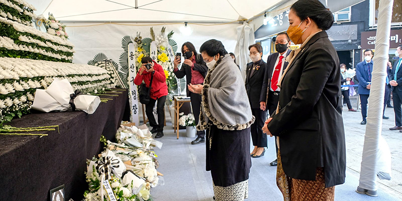 Sebelumnya saat bertemu dengan Ketua Majelis Nasional Korea Selatan Kim Jin-pyo, Puan juga menyampaikan rasa belasungkawa atas Tragedi Itaewon yang juga melukai 196 orang. Ia pun sempat menyinggung Indonesia mengalami peristiwa serupa saat pertandingan sepak bola di Stadion Kanjuruhan, Malang.