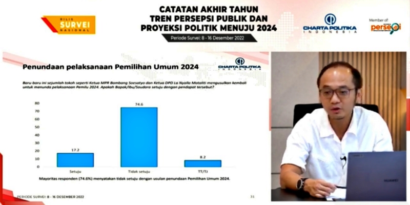 Begitu temuan lembaga survei Charta Politika dalam survei catatan akhir tahun bertema "Tren Persepsi Publik dan Proyeksi Politik Menuju 2024" yang dirilis secara daring, Kamis (22/12).