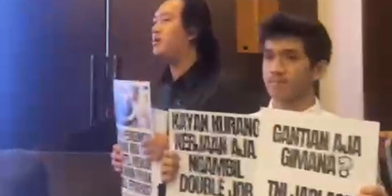 Dalam video yang diunggah akun Instagram @kontras_update, Sabtu 15 Maret 2025, ada tiga orang membawa poster yang menolak rapat Panja RUU TNI digelar tertutup.