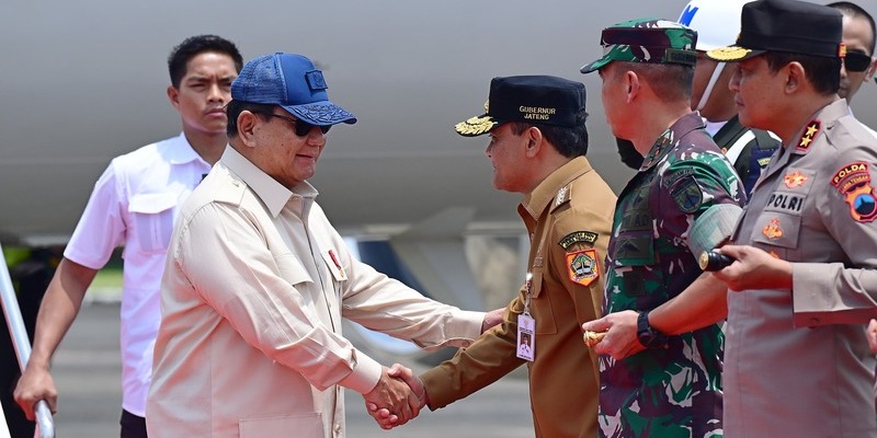 Gubernur Jawa Tengah Ahmad Luthfi menyambut kedatangan Prabowo yang tampak mengenakan baju safari krem dilengkapi topi biru.