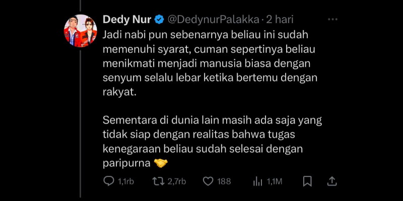 Sebelumnya, akun centang biru Politikus PSI Dedy Nur Palakka @DedynurPalakka pada 9 Juni 2025 lalu meretweet cuitan dari The Last Dodo @bengkel dodo dengan komentar “Mantan Presiden Indonesia yang paling dekat dengan Rakyat namanya” cuit DedynurPalakka.