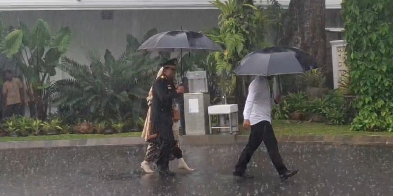 Ia tampak mengenakan seragam dinas upacara kepolisian lengkap, dan sempat berlari kecil menggunakan payung untuk menghindari guyuran hujan sebelum memasuki kompleks istana.