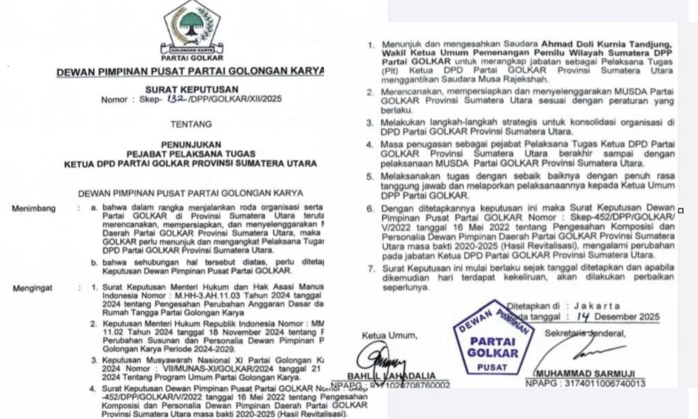 "Menunjuk dan mengesahkan Saudara Ahmad Doli Kurnia Tanjung, Wakil Ketua Umum Pemenangan Pemilu Wilayah Sumatera DPP Partai Golkar, untuk merangkap jabatan sebagai Pelaksana Tugas Ketua DPD Partai Golkar Provinsi Sumatera Utara menggantikan Saudara Musa Rajekshah," bunyi Surat Keputusan (SK) DPP Partai Golkar Nomor: Skep-132/DPP/GOLKAR/XII/2025 yang dikutip RMOL, Kamis, 18 Desember 2025.