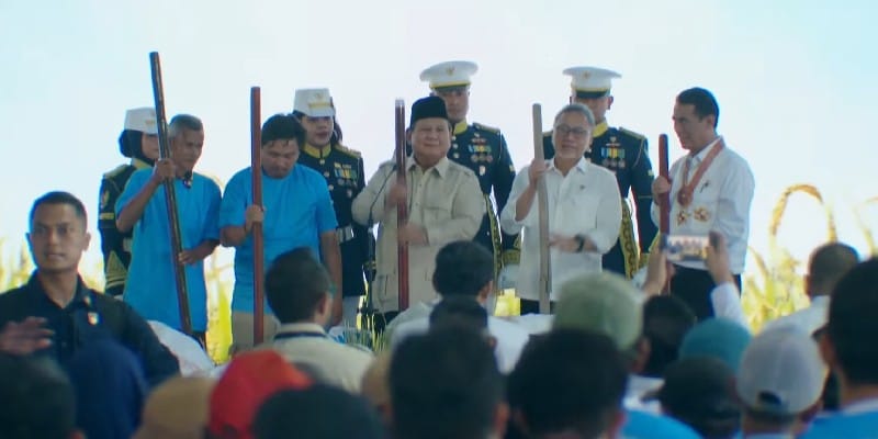 Prabowo yang memegang alu bersiap menumbuk padi yang sudah tersedia di dalam lesung. Ia dengan bangga mengumumkan capaian swasembada Indonesia.