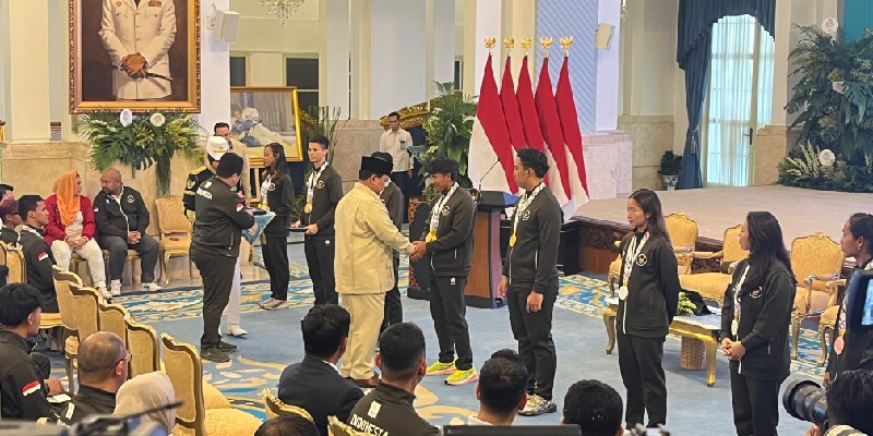 Presiden menyerahkan sebuah kotak berisi buku rekening yang memuat dana bonus sebagai bentuk apresiasi negara atas prestasi mereka di ajang internasional.