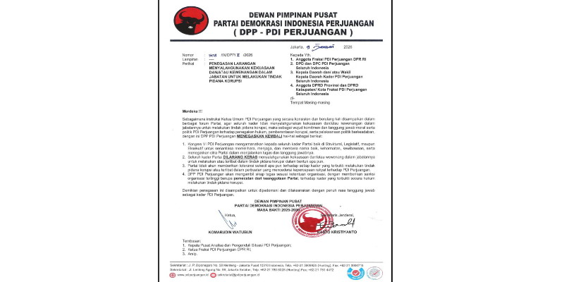 Penegasan tersebut tertuang dalam Surat Internal DPP PDIP Nomor 508/IN/DPP/I/2026 tertanggal 9 Januari 2026.