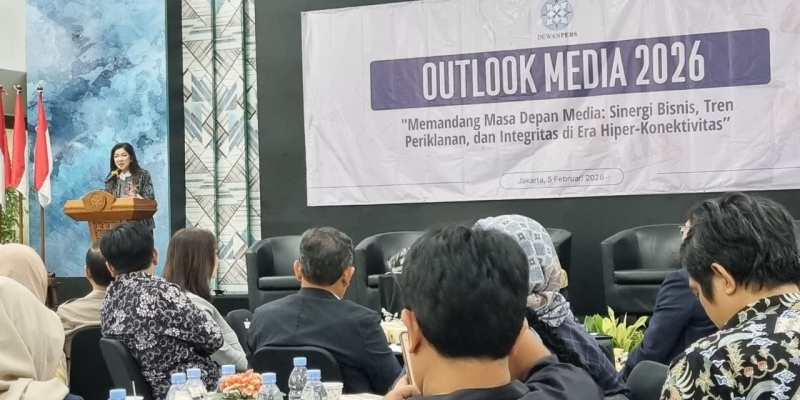 keynote speech dalam kegiatan Outlook Media 2026 bertajuk "Memandang Masa Depan Media: Sinergi Bisnis, Tren Periklanan, dan Integritas di Era Hiper-Konetivitas", di Hall Dewan Pers, Jalan Kebon Sirih, Jakarta Pusat, Kamis, 5 Februari 2026.