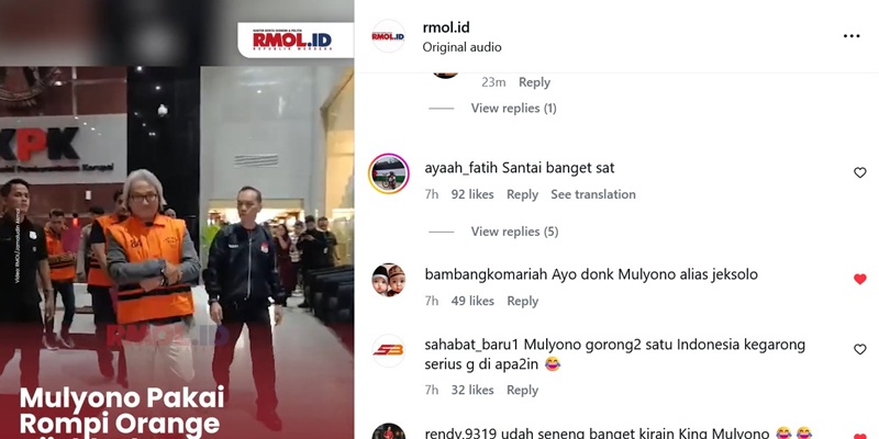 RMOL, Jumat, 6 Februari 2026, unggahan video berjudul “Mulyono Pakai Rompi Oranye Dijebloskan ke Rutan KPK” dibanjiri komentar warganet.