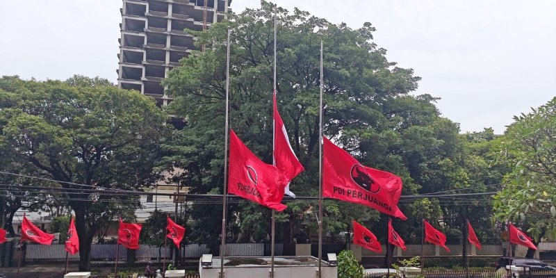 Sebagai simbol berkabung, PDIP mengibarkan bendera Merah Putih dan bendera partai setengah tiang di Kantor DPP PDIP, Menteng, Jakarta Pusat, 3 Maret 2026.