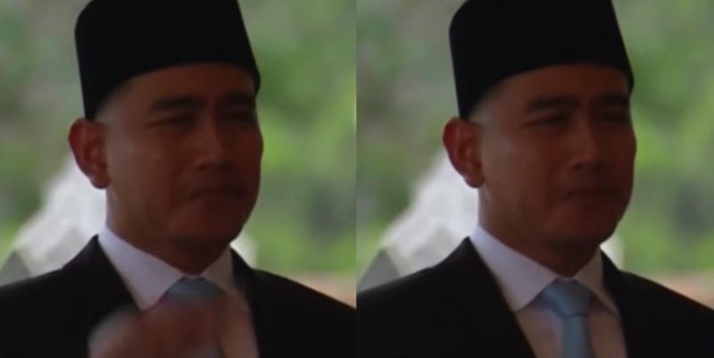 Gibran yang berdiri mendampingi Prabowo sebagai Inspektur Upacara, terlihat sedikit tersentak saat suara tembakan pertama dilepaskan.