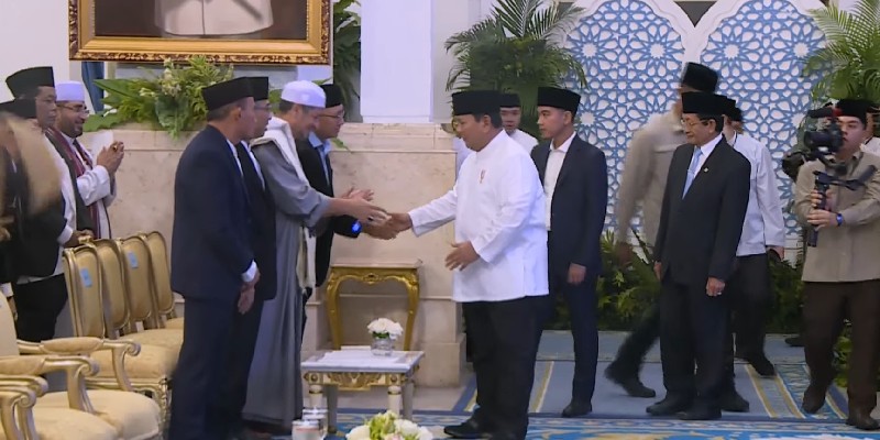 RMOL sekitar pukul 19.40 WIB, Presiden Prabowo yang mengenakan baju koko putih dipadu peci hitam berjalan memasuki aula Istana Negara.