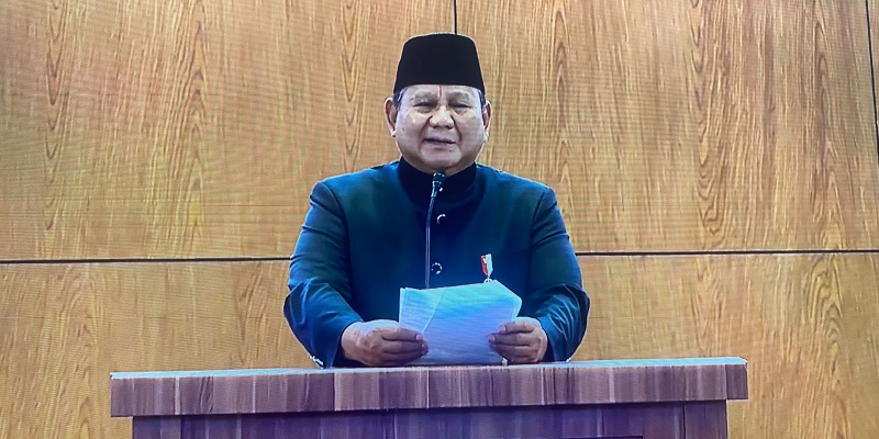 Berdasarkan siaran langsung Sekretariat Presiden, Prabowo tampak mengenakan beskap dan peci hitam. Kehadirannya disambut Menteri Pemuda dan Olahraga, Erick Thohir.