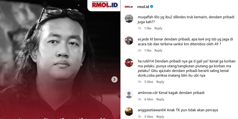 RMOL, Kamis malam, 16 April 2026, banyak warganet tidak mempercayai motif pelaku penyiram air keras terhadap Andrie hanya karena masalah dendam pribadi.