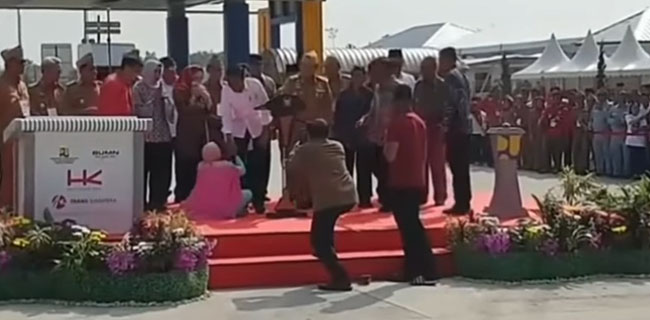 Beberapa ibu menangis menuntut ganti rugi karena rumahnya dihancurkan untuk pembangunan jalan tol yang diresmikan Jokowi.