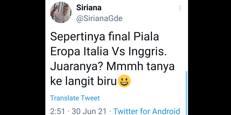 Saya memprediksikan Italia sebagai juara. Italia dan Inggris sama-sama tim bagus. Tren Inggris bahkan makin bagus, clean sheet di babak knock out. Sedangkan Italia yang cleansheet di babak grup, sudah kebobolan 3 kali di fase knock out.