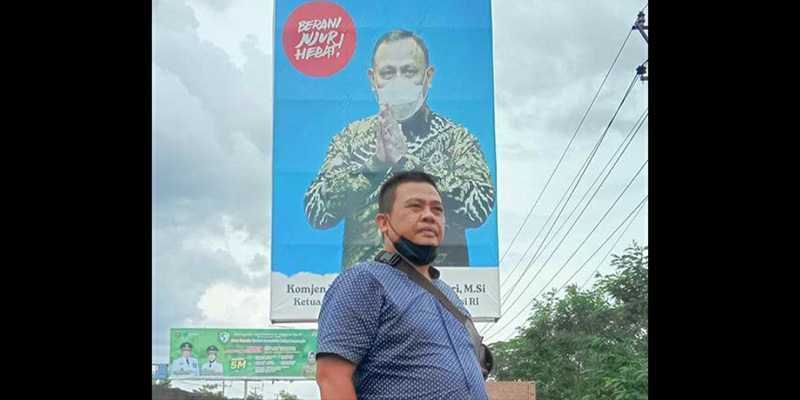Foto ikon panglima tertinggi pemberantasan korupsi di negeri ini. Dibantu Farid dan kawan-kawan, secara sukarela berdirilah sang tokoh agar ingat tak korupsi di jalan lintas keluar dan masuknya setiap orang yang datang atau ingin terbang dari Bandara Radin Inten II.