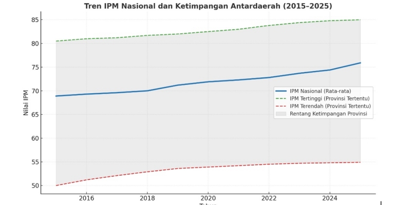 Pada 2025, rentang IPM provinsi masih sangat lebar: 54,91 (Papua Pegunungan) hingga 85,05 (DKI Jakarta). Mobilitas status terjadi, di mana Kepulauan Riau menembus “sangat tinggi” (80,53) dan Papua Barat Daya naik ke “tinggi” (70,55), namun peta ketimpangan belum berpindah drastis: 3 provinsi “sangat tinggi”, 30 “tinggi”, 4 “sedang”, dan 1 “rendah”.