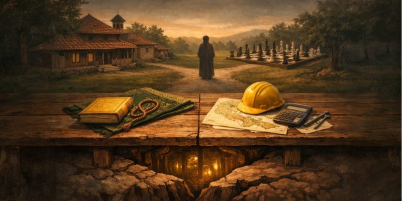 cashflow, dan operator tambang. Kitab kuning bersisian dengan proposal bisnis. Doa qunut berdampingan dengan kalkulator.