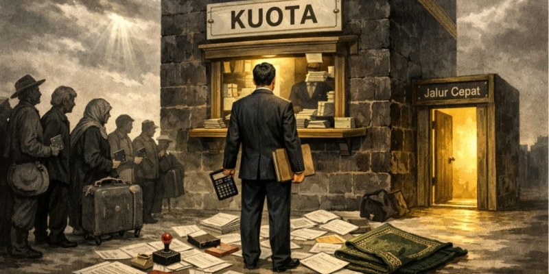 Yang paling menyedihkan, di tengah hiruk-pikuk pembelaan dan bantahan, jarang terdengar suara tentang para calon jemaah: mereka yang menjual sawah, menggadaikan perhiasan, menunggu bertahun-tahun di antrean, dan akhirnya mendapati bahwa akses menuju ibadah pun bisa “diatur”. Seolah-olah surga punya loket, dan loket itu bisa ditawar.