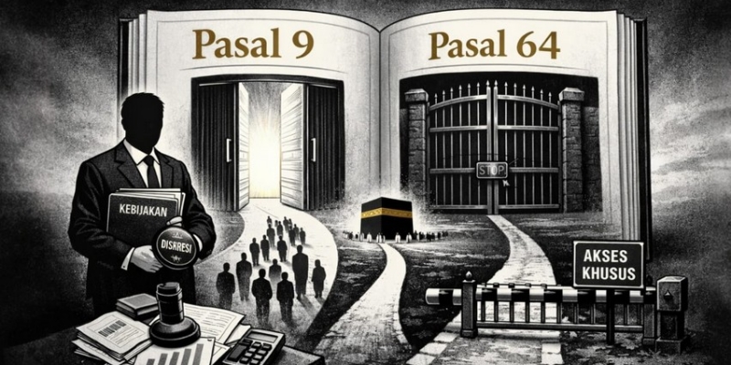 Undang-undang Haji ini, dengan susunan Pasal 9 lalu Pasal 64, sebenarnya sedang mengajari kita membaca: pertama, negara perlu lentur; kedua, kelenturan itu harus dibatasi oleh keadilan.